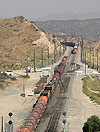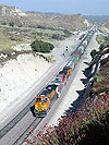 Just south of Victorville, California, the westbound track crosses over the eastbound track adjacent to the Mojave Narrows Regional Park. This westbound was seen in October, 2001.