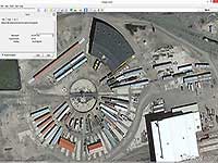 | As mentioned above, the UP roundhouse in Cheyenne, Wyoming was chosen for this project. Since my friend did not want to send me all the way to Cheyenne from Chicago to get some measurements, I used Google Earth to get the overall dimensions. In this top down view, I used the "Ruler" tool to get the perimeter dimensions. For all of the door and window details, I used photos from the internet, which I cannot show here, due to copyright laws.