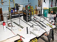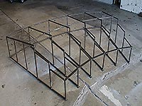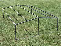 | | As mentioned earlier, this structure will be left outside, year around. In order to provide some protection, I welded up a frame that can be assembled over the roundhouse. When in place, 4 pieces of plywood are placed on top, and a tarp stretched over it. |
