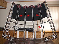 | | Ron wanted interior lighting, so I used strips of LED lights, purchased at Menards to provide a uniform light throughout the building. The red arrows point to some of the LED's. These were all wired together and then run to an adjacent smaller building that holds a motorcycle battery. |