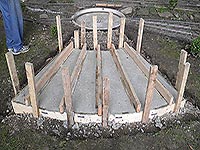 | | With the building complete, I turned my attention to the exterior work. I hired a contractor to pour a concrete pad for the roundhouse. I provided them a very custom form, that allowed the top of the rail of the interior tracks to be flush with the floor. |