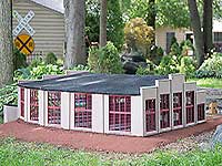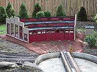 2013 saw very little activity in the garden. We were somewhat burned out by the previous year's preparation for the national convention (see our 2012 page). I was asked to build a G scale, roundhouse for a friend. Since he has mostly Union Pacific equipment, we felt that a UP structure would be most appropriate. I only know of one, large, UP roundhouse that is still standing (and in use) and that is in Cheyenne, Wyoming. Many photos are available of it, and I could get approx. dimensions using Google Earth. The following are images of how the building was constructed and placed in Ron and Gayle's garden. The actual roundhouse is currently 7 stalls, though when built was 28. Ron asked that his be 5 stalls. This took most of 2013 and the first half of 2014 to complete, putting in 203 hours to complete. It is built using Precision Board, which is a closed cell, foam product that has characteristics of wood.