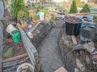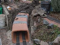 | | Other garden railroaders had told me about using clay chimney liner piping. I was able to find the size I needed (for double track) at a local building supplies company. With the help of an older friend, we dug up the first of our 3 tunnels.
