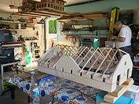 | | As mentioned before, I started constructing new buildings for our "Grand Canyon" themed garden. I started the station and the mule barn. The station is framed with precison board, with wood doweling, and will have hand cut wood shingles applied to the exterior. I am actually building 2 stations. The first one is for Ron, and the second one will be for my garden.