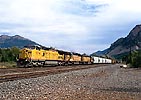 Here, a westbound is on the old double track mainline over Sherman Hill, at Buford, Wyoming. Note the stock cars directly behind the locos. Shot taken in 1991. |