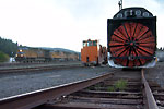 A eastbound freight passes by a rotary and Jordon spreader, sitting idle for the summer in Truckee, California, just east of the Donner Summit in May, 2004. |